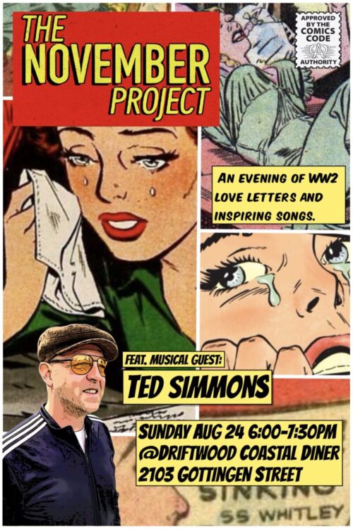The November Project is a true story based on over 300 love letters my grandfather wrote to my grandmother during World War II. I will read an abridged version of the love letters and Ted Simmons will sing songs of love and longing that echo the sentiments of the love letters.